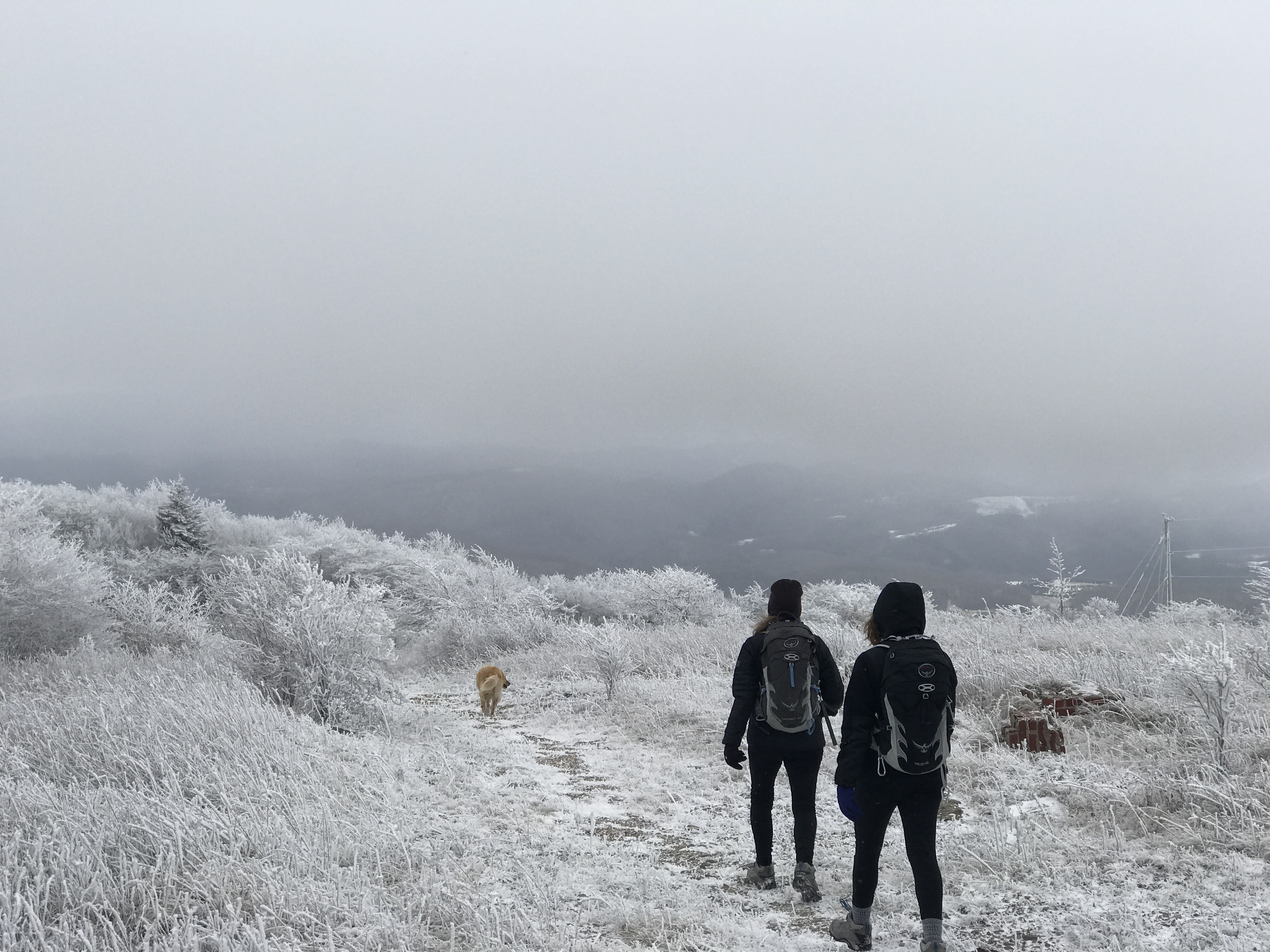 We drove to our destination and yet another section of the Appalachian Trail and another summit to climb. This time it was the 2nd highest peak in Virginia–a mountain called White Top. We were meeting our daughter at the trail head and while driving it had begun to blow quite a bit of snow on us. It had begun to stick to the roads and made for some fairly slick spots as we drove up higher in elevation. We pulled in and my husband noted the snow flying and saw a thermometer on the sign post–got out to read it and said it read 22 degrees. With the winds about 15-20 mph, we were definitely going to be experiencing wind chills in the single digits. I will be honest with all of you and say that this did give us several “are you sure?” comments back and forth while waiting for our daughter to arrive.
