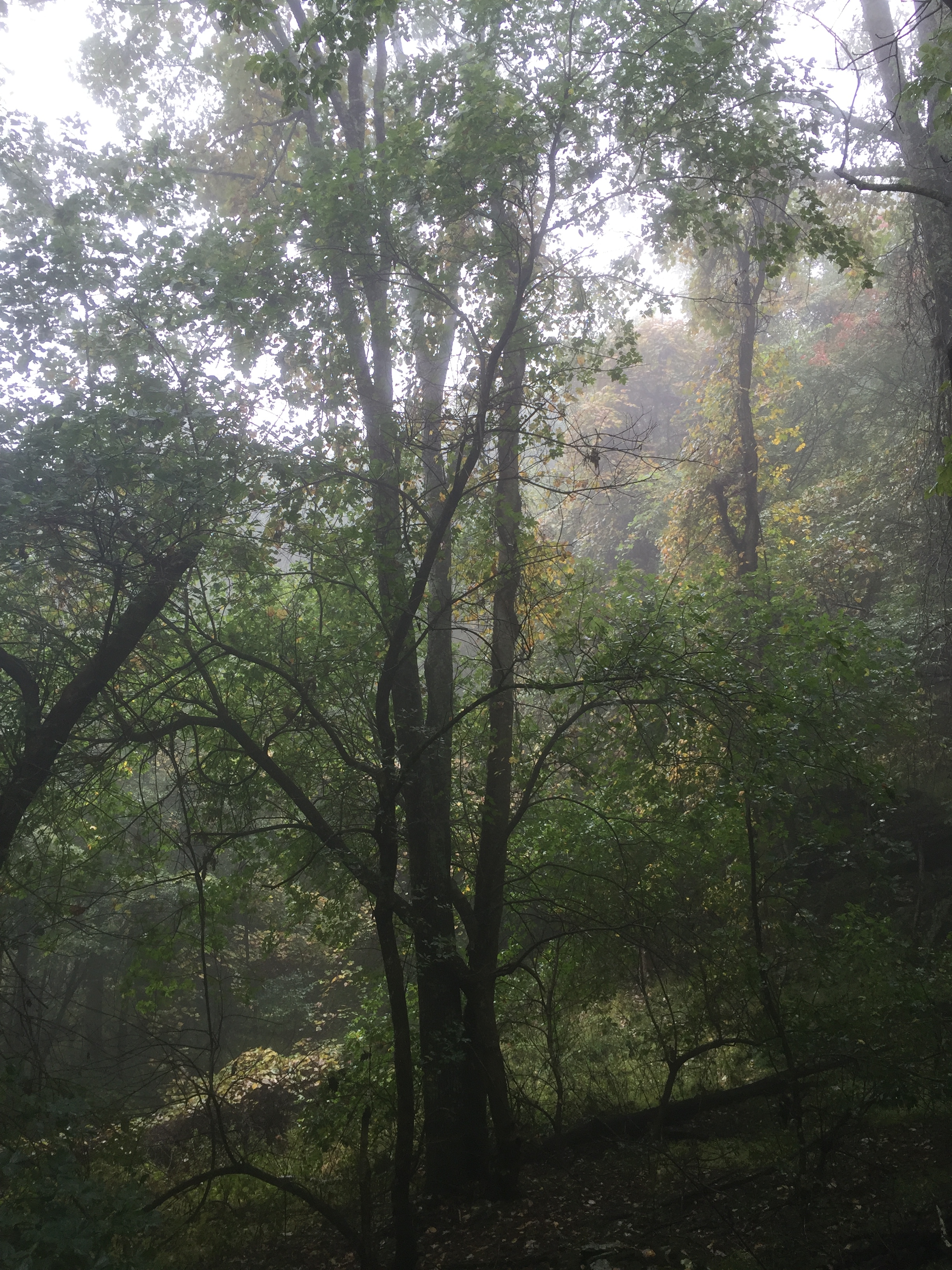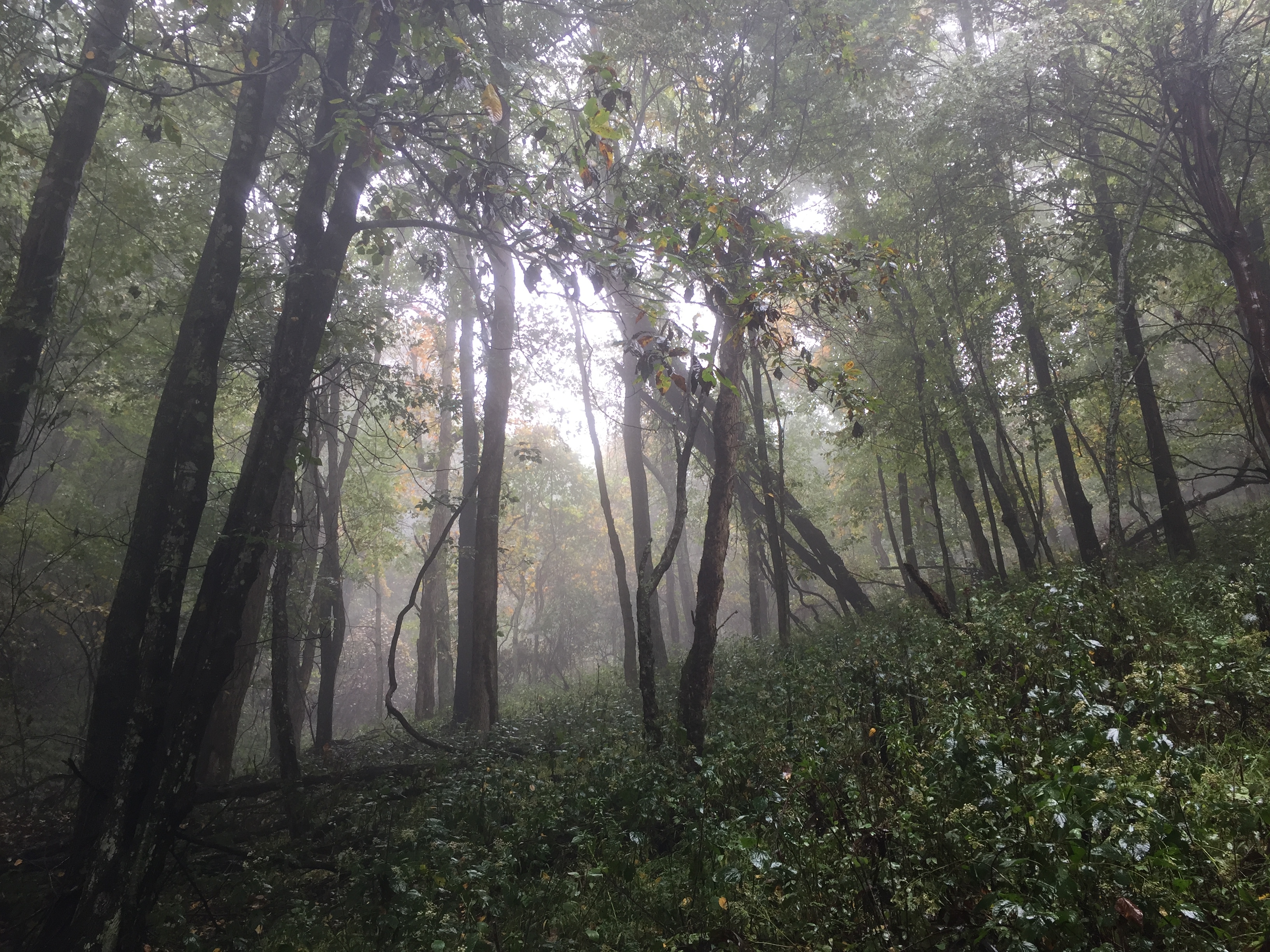 I took a hike through the woods and hills on a foggy and misty Sunday afternoon recently. The normally breathtaking views are markedly changed from those of a clear day, but they are no less beautiful. There is quiet as the mist hangs on the leaves and branches in the stillness. The sense you get is that just possibly–you may be really walking in the clouds. You see the outline of the tree trunks softened and yet larger than they normally appear when there is no hazy background framing them.