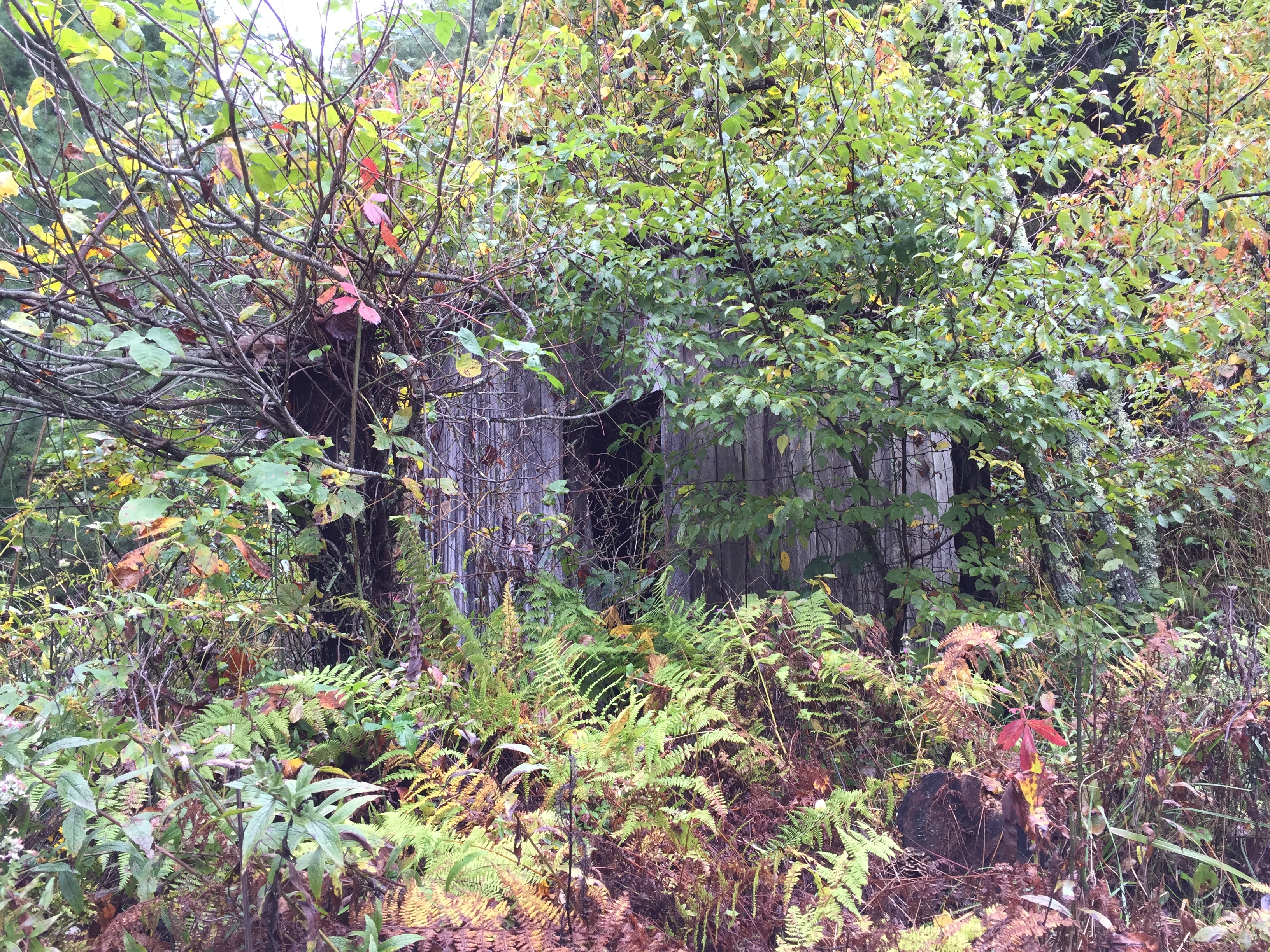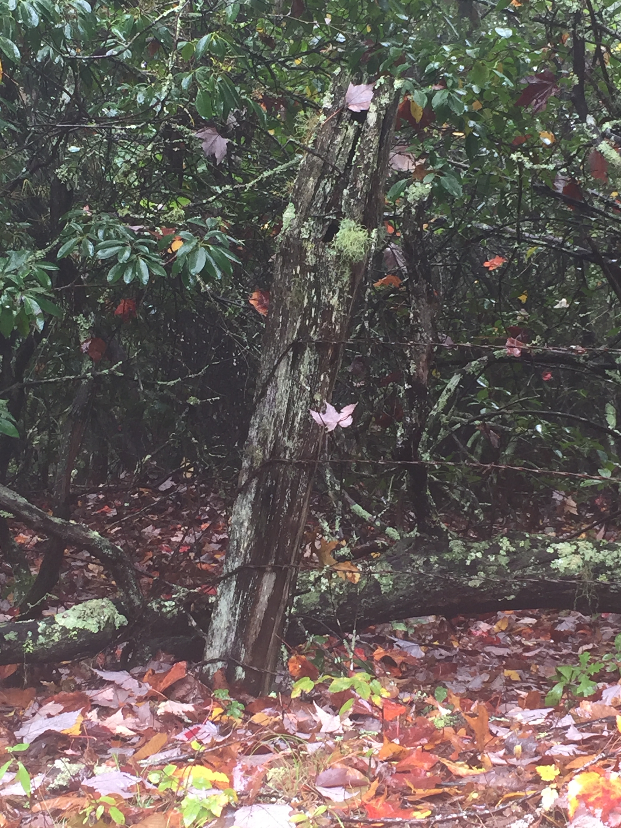 Every time I hike these hills I am reminded of those who lived here before and on this foggy early fall day I see more evidence of their lives. And old fence post with remnants of rusty barbed wire line old historic tracings of property lines and fields from years before. Some mountain farmers from generations ago cut down a tree, chopped it into sections, dug a hole in the ground and placed the fence post into it. They firmed the dirt back around its base and then once the posts were in they ran the barbed wire and nailed it fast. So often only time and weather have affected their hard work.