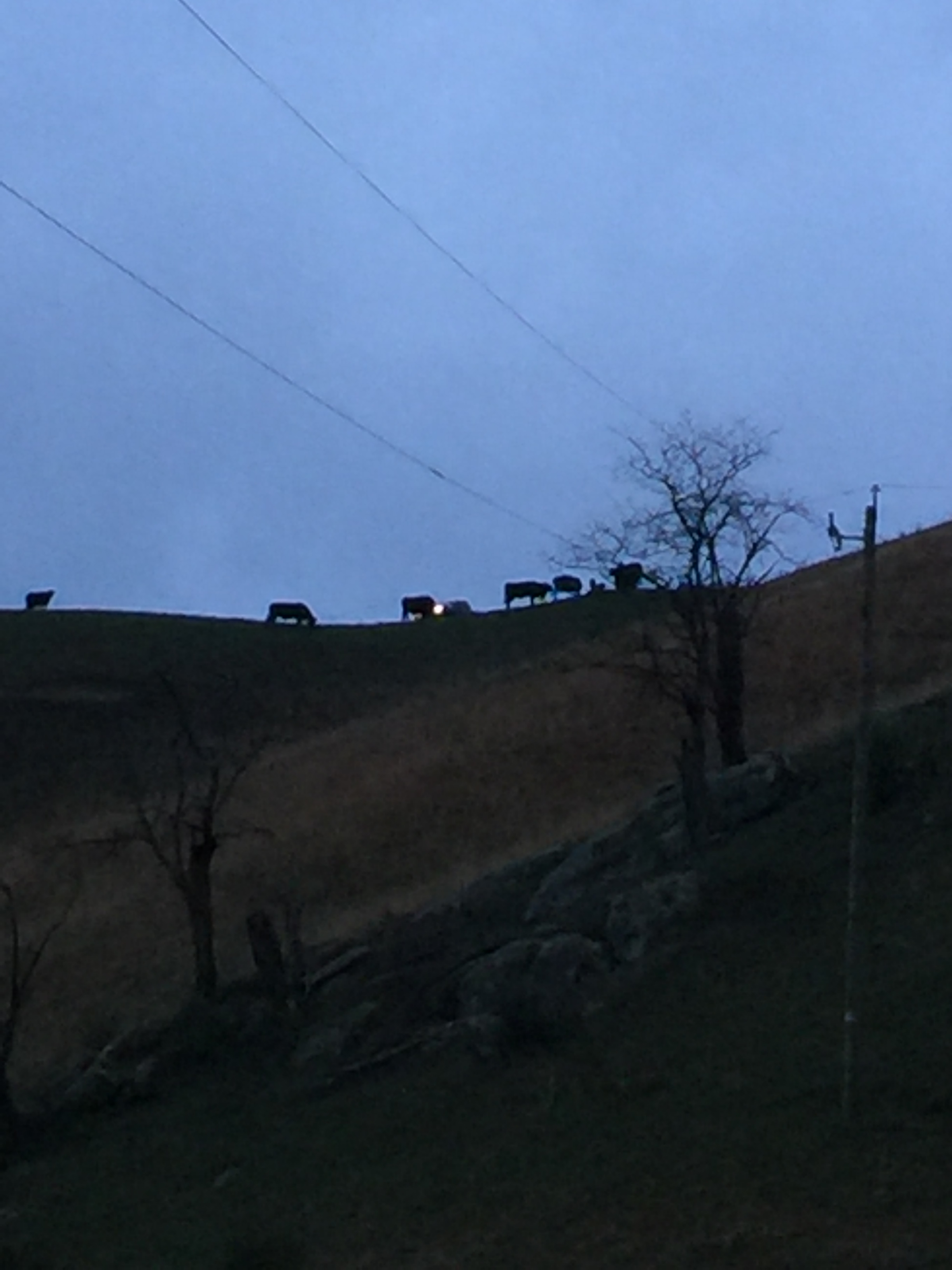 Riley and I have walked more with the coming of warmer weather and sunshine. We’ve made great friends with the baby calves that have been born this year. I love to see those young animals romp and play on the hillsides and pastures. And when you look at these pastures one can imagine why grazing cattle and sheep remain primary uses of this land. The steep slopes and hills simply make other types of agriculture impossible. I see so much evidence of the dedication of these farmers to caring for their animals. One late evening I saw a farmers truck on top of the ridge bringing food to his cattle or perhaps checking on a new calf.